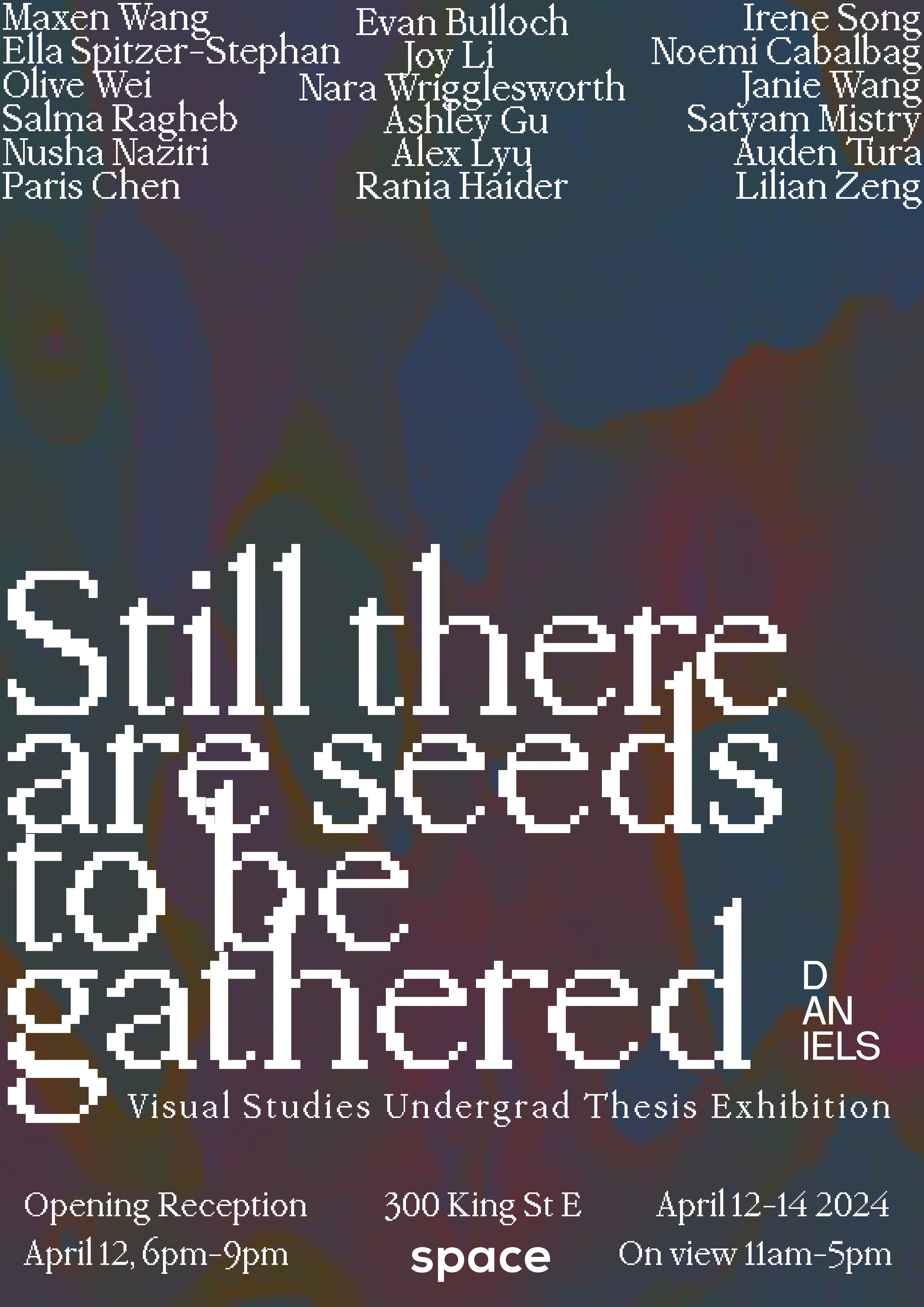 Still there are seeds to be gathered features the work of Evan Bulloch, Noemi Cabalbag, Paris Chen, Ashley Gu, Rania Haider, Joy Li, Alex Lyu, Satyam Mistry, Nusha Naziri, Salma Ragheb, Irene Song, Ella Spitzer-Stephan, Auden Tura, Janie Wang, Maxen Wang, Olive Wei, Nara Wrigglesworth, and Lilian Zeng.
